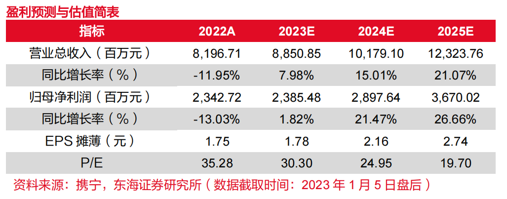 我们预计公司2023-2025年收入88.51、101.79、123.24亿元,收入增速分别为7.98%、15.01%、21.07%。公司归母净利润分别为23.85、28.98、36.70亿元,对应PE分别为30、25、20倍。