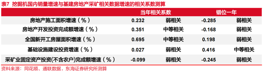 国内挖掘机销量与房地产开发相关性较强。因国内挖掘机的销量与国内下游基建、房地产和矿山开采最为相关,取2007-2022年国内挖掘机的销量增速与这三个下游行业的主要指标增速进行相关性分析。分析表明,全国新开工房屋面积当年增速与国内挖掘机销量增速呈中等相关度,说明国内房地产新开工面积的上升,能明显带动国内挖掘机的销量。另外,基础设施建设投资增速与错位一年的国内挖掘机销量增速呈中等相关度,说明需求相对于基础建设投资启动有一定的滞后性,并不能立马带动当下的销量。采矿业的固定资产增速与国内挖掘机销量增速呈弱相关性,主要因国内房地产与基建占挖掘机需求,且采矿业以大型挖掘机为主,数量与房地产带动的中小挖掘机不在一个量级。