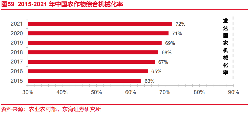 我国农作物机械化率仍有较大发展空间。受益于农机购置补贴政策、土地流转政策促进农业规模化经营、叠加劳动成本和城镇化率的提升,农业机械化渗透率提升是趋势。中国农业机械化水平从2015年63%提升至2021年72%。根据农业农村部印发的《“十四五”全国农业机械化发展规划》,到2025年农作物耕种收综合机械化率达到75%。与发达国家农业机械化90%以上的水平相比,中国农业机械化发展仍存在较大空间。