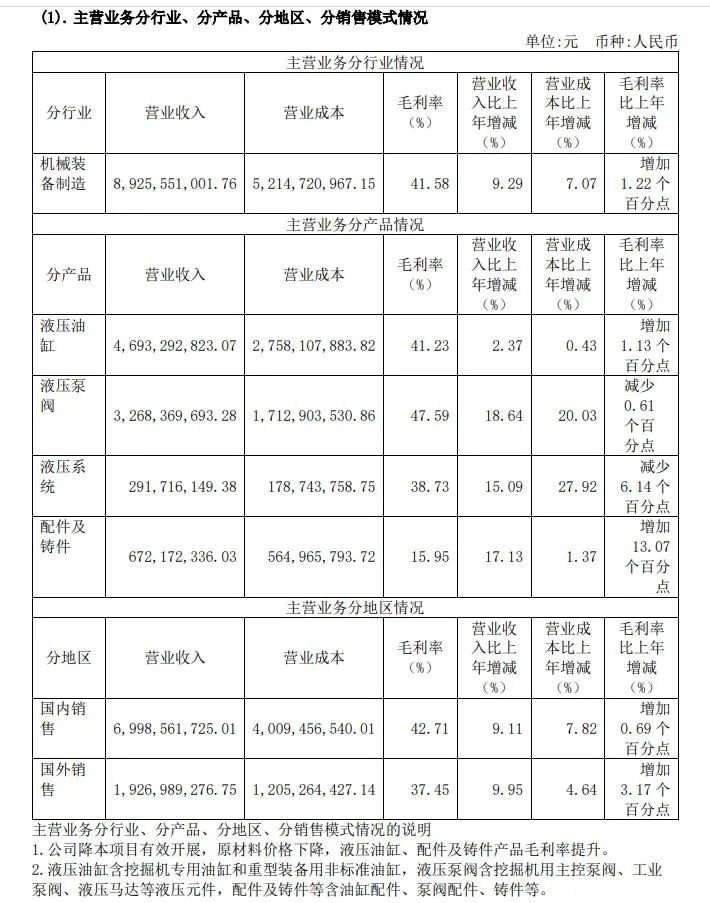 近日恒立液压发布年度业绩报告称,2023年营业收入约89.85亿元,同比增加9.61%;归属于上市公司股东的净利润约24.99亿元,同比增加6.66%;基本每股收益1.86元,同比增加3.91%。