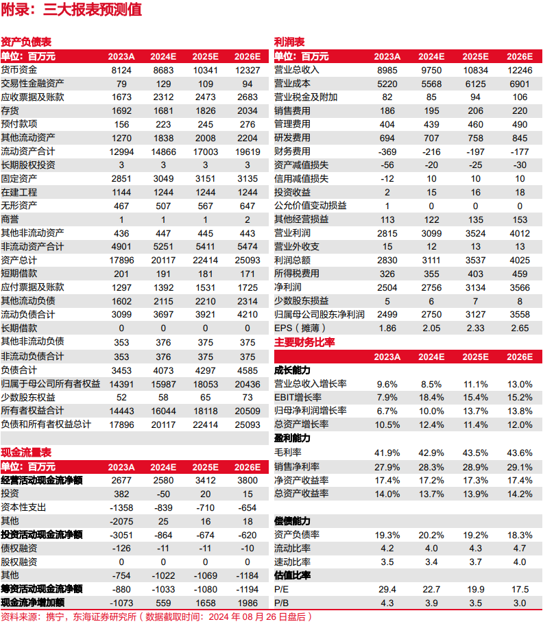 事件:公司2024上半年实现营收48.33亿元,同比增长8.56%;归母净利润达12.88亿元,同比增长0.71%,符合预期;2024上半年毛利率和净利率分别为41.64%和26.69%;2024第二季度实现营收24.71亿元,同比增长22.05%;归母净利润6.86亿元,同比增长5.00%。