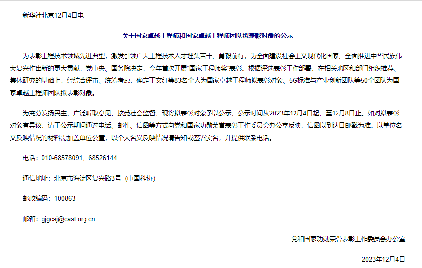 为表彰工程技术领域先进典型,激发引领广大工程技术人才埋头苦干、勇毅前行,为全面建设社会主义现代化国家、全面推进中华民族伟大复兴作出新的更大贡献,党中央、国务院决定,今年首次开展“国家工程师奖”表彰。根据评选表彰工作部署,在相关地区和部门组织推荐、集体研究的基础上,经综合评审、统筹考虑,确定83名个人为国家卓越工程师拟表彰对象、50个团队为国家卓越工程师团队拟表彰对象。