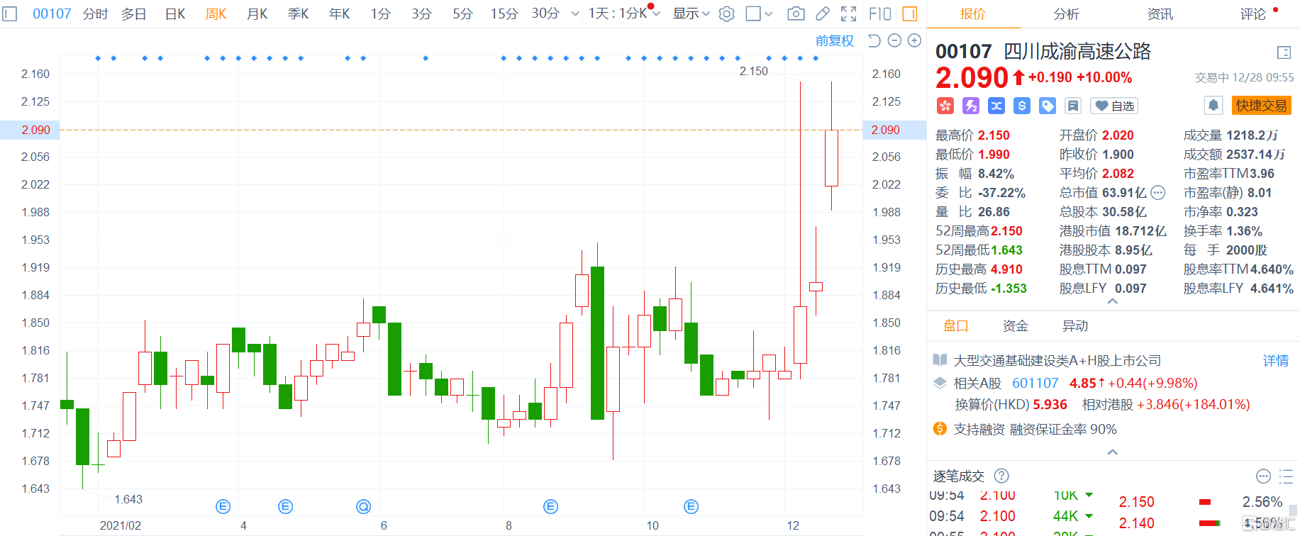 四川成渝高速公路(00107.HK)大涨10%,报2.09港元;四川成渝(601107.SH)则封死涨停板。