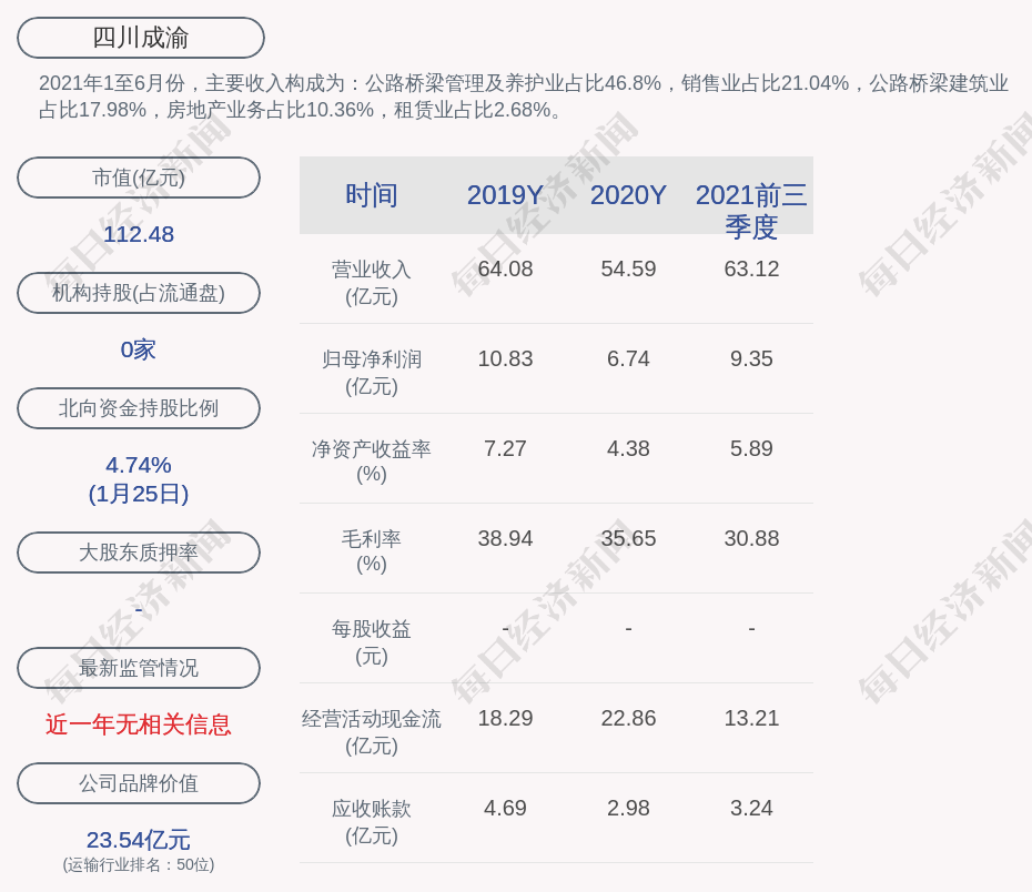 2021年1至6月份,四川成渝的主要收入构成为:公路桥梁管理及养护业占比46.8%,销售业占比21.04%,公路桥梁建筑业占比17.98%,房地产业务占比10.36%,租赁业占比2.68%。