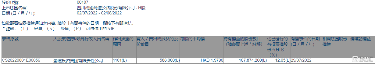 根据联交所最新权益披露资料显示,2022年7月29日,四川成渝高速公路(00107.HK)获蜀道投资集团有限责任公司在场内以每股均价1.979港元增持58.8万股,涉资约116.37万港元。
