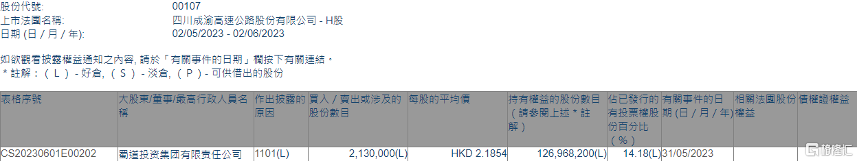 格隆汇6月2日丨根据联交所最新权益披露资料显示,2023年5月31日,四川成渝高速公路(00107.HK)获蜀道投资集团有限责任公司在场内以每股均价2.1854港元增持213万股,涉资约465.5万港元。