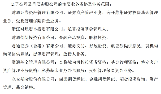 2020 年年度报告显示,财通证券的子公司及重要参股公司的主要业务资格及业务范围为:财通证券资产管理有限公司:证券资产管理业务;公开募集证券投资基金管理业务;受托管理保险资金业务。浙江财通资本投资有限公司:私募投资基金管理人。财通创新投资有限公司:金融产品投资,股权投资。财通证券(香港)有限公司:证券交易、孖展融资;就证券提供意见;就机构融资提供意见;提供资产管理;放债人业务。财通基金管理有限公司:合格境内机构投资者资格;基金管理资格;特定客户资产管理业务资格;私募基金业务外包服务;受托管理保险资金业务。永安期货股份有限公司:商品期货经纪、金融期货经纪、期货投资咨询,资产管理,基金销售。