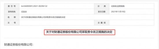 2021年11月19日,中国证监会发布了《关于对财统证券股份有限公司采取责令改正措施的决定》,决定书显示,财通证券存在多项违规行为,分别是: