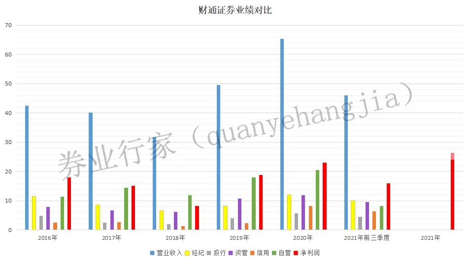 2021年前三季度,财通证券营业收入46.08亿元,同比下降0.98%;净利润为15.94亿元,同比增长5.30%。以代理买卖证券业务净收入计,经纪业务揽收10.00亿元,同比增长9.98%;资管业务收入9.47亿元,同比增长4.76%;自营业务收入8.11亿元,同比下降37.59%;以利息净收入计,信用业务收入6.33亿元,同比略增0.52%;投行业务揽收4.54亿元,同比增长13.59%。