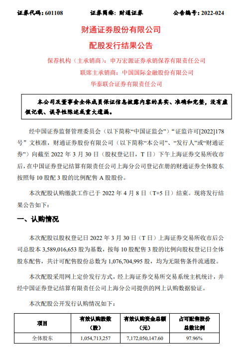 4月12日,财通证券刚刚完成了A股配股。有效认购数量为10.55亿股,占本次可配售股份总数10.77亿股的97.96%。募集资金总额71.72亿元,接近此前计划的80亿元募资上限。