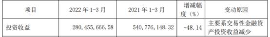 2022年第一季度,财通证券的基本每股收益0.04元,同比下降66.67%;加权平均净资产收益率为0.62%,同比减少1.23个百分点;投资收益为2.80亿元,同比下降48.14%,主要系交易性金融资产投资收益减少。