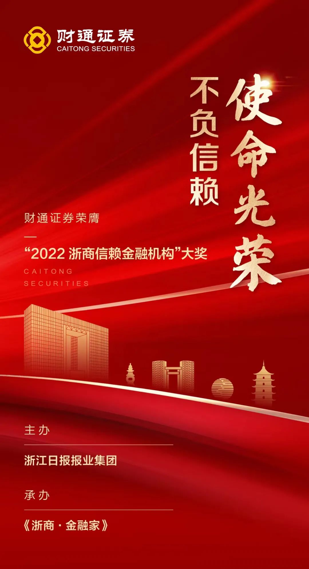 7月5日,2022(第十三届)浙商信赖金融机构榜单发布。该榜单主要根据浙江省委省政府现阶段对金融工作的要求,充分征求各金融监管部门的意见和建议,特别聚集金融机构在提升金融供给能力、构建数智化区域金融运行体系、更好服务高质量发展、高品质生活和高效能治理上的突出贡献。凭借深耕浙江、服务浙商浙企、助力区域经济高质量发展等方面的担当作为,财通证券荣膺“2022浙商信赖金融机构”大奖。