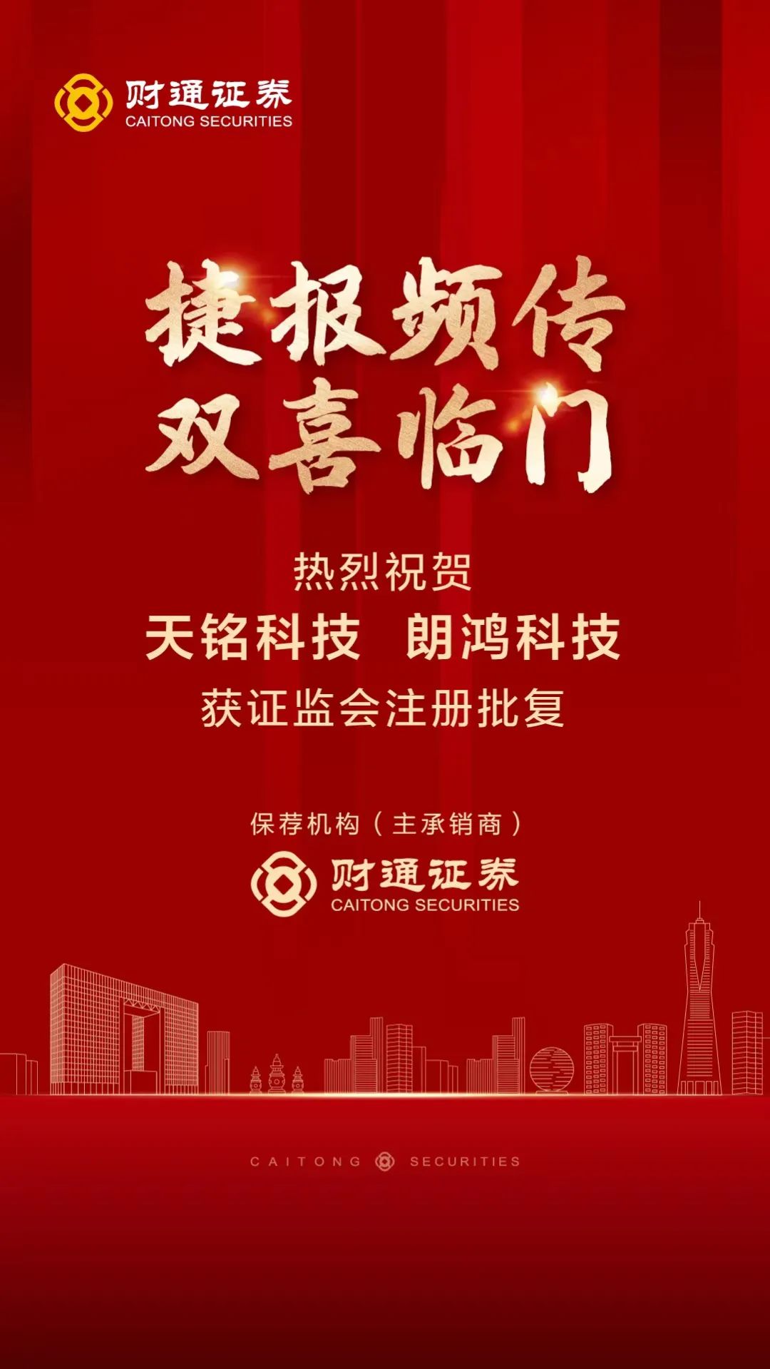 2022年8月3日,财通证券担任保荐机构及主承销商的杭州朗鸿科技股份有限公司(简称“朗鸿科技”)和杭州天铭科技股份有限公司(简称“天铭科技”)向不特定合格投资者公开发行股票并在北交所上市项目,同时获得中国证监会同意注册批复。财通证券投行业务捷报频传,双喜临门!