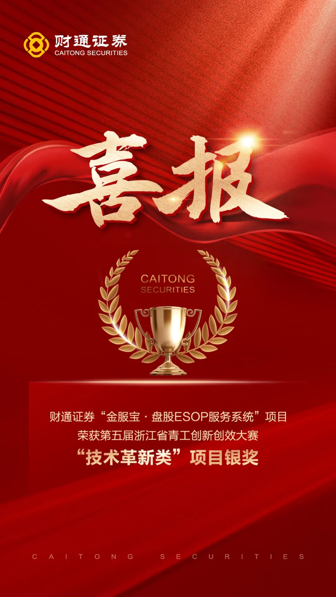 8月22日,财通证券选送的“金服宝·盘股ESOP 服务系统”项目从近150个参选项目中脱颖而出,荣获第五届浙江省青工创新创效大赛“技术革新类”项目银奖!