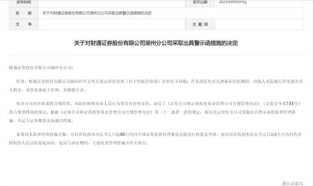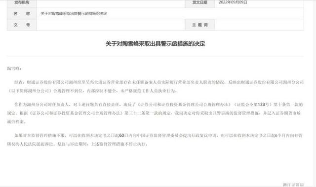 浙江证监局指出,陶雪峰作为湖州分公司时任负责人,对湖州织里吴兴大道证券营业部发生的上述问题负有直接责任,也吃到了罚单:被浙江证监局采取出具警示函措施的决定,并记入证券期货市场诚信档案。