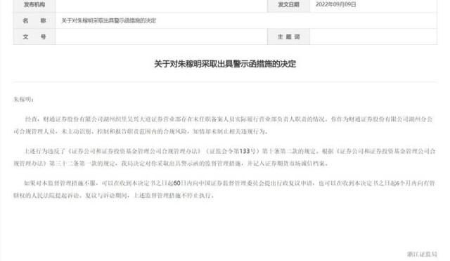 浙江证监局公告指出,朱稼明作为财通证券湖州分公司合规管理人员,未主动识别、控制和报告职责范围内的合规风险,知情却未制止相关违规行为,针对上述情况,浙江证监局决定对朱稼明采取出具警示函的监督管理措施,并记入证券期货市场诚信档案。