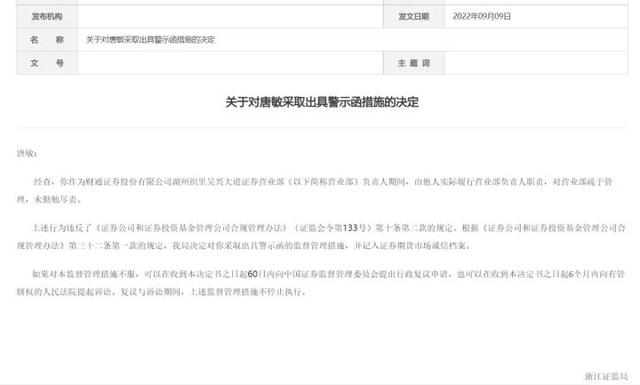 而财通证券官方任命的该营业部负责人应该是唐敏。浙江证监局公告指出,经查,唐敏作为财通证券股份有限公司湖州织里吴兴大道证券营业部(以下简称营业部)负责人期间,由他人实际履行营业部负责人职责,对营业部疏于管理,未勤勉尽责。浙江证监局决定对唐敏采取出具警示函的监督管理措施,并记入证券期货市场诚信档案。
