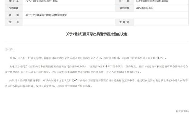 对此,浙江证监局决定对沈红霞采取出具警示函的监督管理措施,并记入证券期货市场诚信档案。