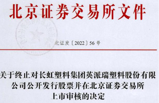 北交所于2022年4月6日受理了英派瑞提交的公开发行相关申请文件,并按照规定进行了审核。2022年9月13日,英派瑞向北交所提交了《长虹塑料集团英派瑞塑料股份有限公司关于撤回向不特定合格投资者公开发行股票并在北京证券交易所上市申请文件的申请》。根据《北京证券交易所向不特定合格投资者公开发行股票并上市审核规则(试行)》第五十三条的有关规定,北交所决定终止英派瑞公开发行股票并在北京证券交易所上市的审核。