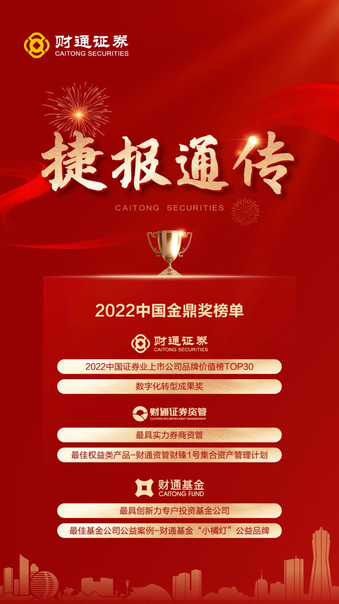 财通证券子公司财通资管凭借在财富管理领域突出的综合实力,荣获“2022年度最具实力券商资管”,这也财通资管连续三度问鼎此项殊荣,同时旗下权益类资管计划荣获“2022年度最佳权益类产品”。子公司财通基金荣获“2022年度最具创新力专户投资基金公司”,同时旗下基金公益品牌荣获“2022年度最佳基金公司公益案例”。
