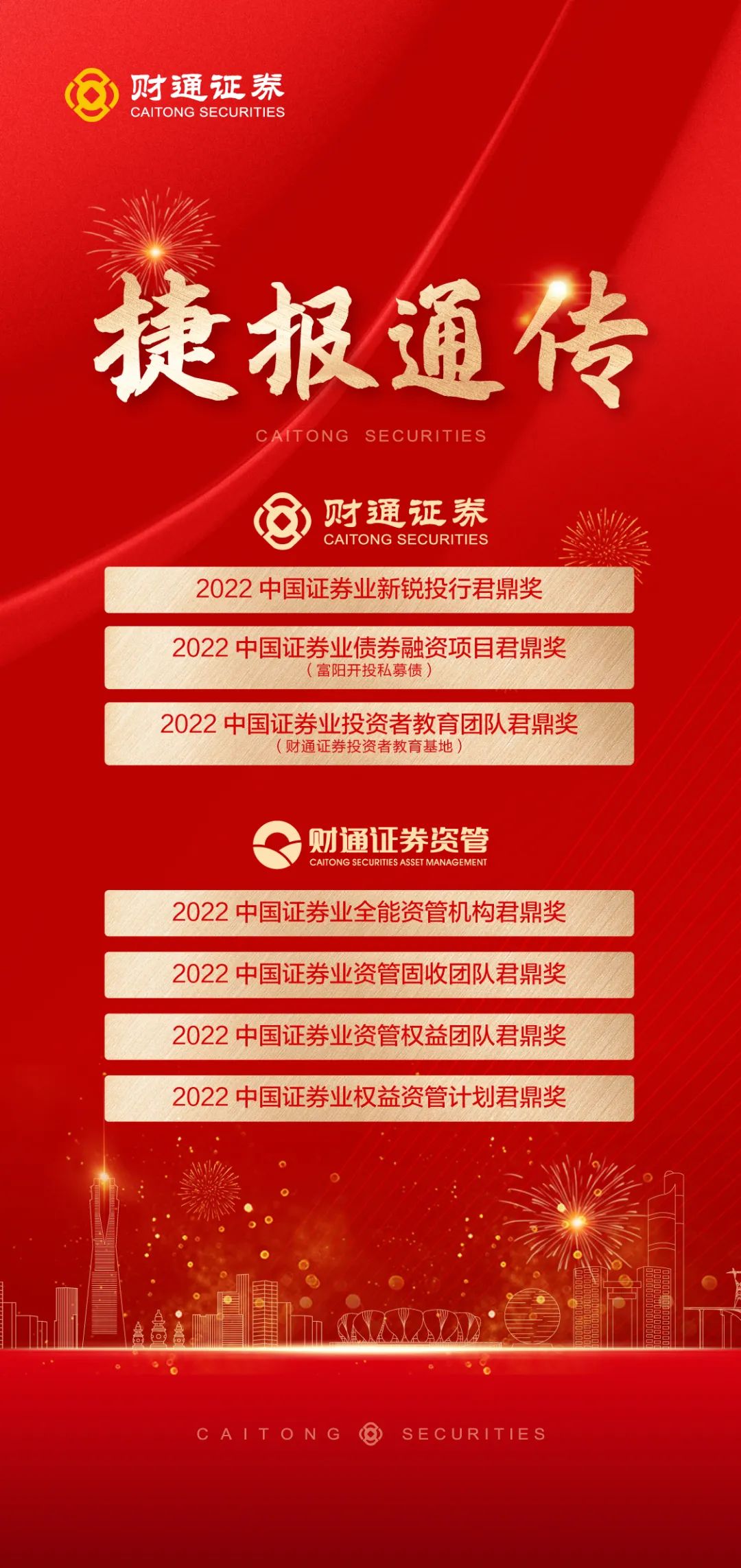 日前,由证券时报举办的2022年中国证券业君鼎奖系列评选结果揭晓,财通证券凭借在投资银行、投资者教育领域的卓越表现,摘得“2022中国证券业新锐投行君鼎奖”“2022中国证券业债券融资项目君鼎奖”“2022中国证券业投资者教育团队君鼎奖”。财通证券旗下子公司财通证券资管凭资产管理的出色表现以及严谨的风控体系,斩获“2022中国证券业全能资管机构君鼎奖”“2022中国证券业资管固收团队君鼎奖”“2022中国证券业资管权益团队君鼎奖”三大重量级奖项,还有一只权益类集合计划获评“2022中国证券业权益资管计划君鼎奖”。