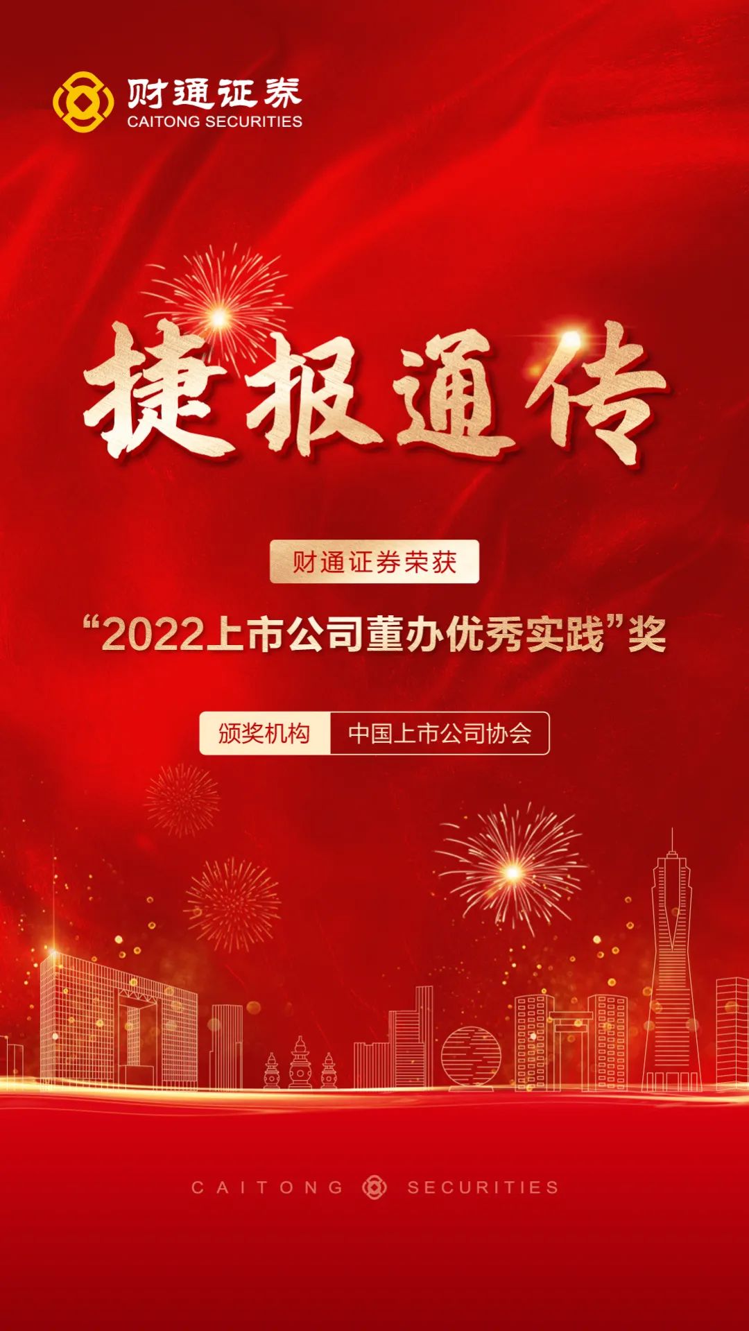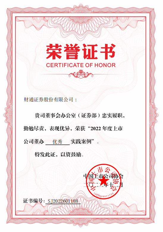2022年12月16日,中国上市公司协会(以下简称中上协)发布“2022上市公司董办最佳实践”评选结果,财通证券荣获“2022上市公司董办优秀实践”奖。