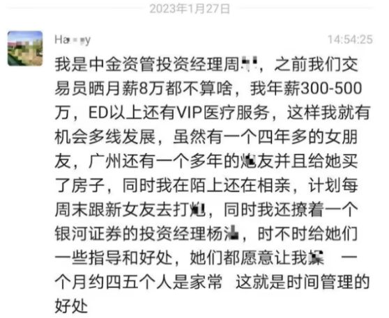 1月27日晚上,网传一位中金资管经理周某在微信群聊中自爆:“虽然有一个四年多的女朋友,广州还有一个多年的X友,同时在陌陌上还在相亲,计划每周末跟新女友去约,同时还撩着某证券的投资经理杨某。一个月约四五个人是家常,这就是时间管理的好处。”