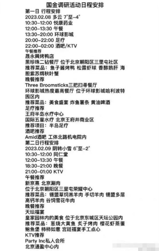 2月7日晚间,网传一份国金证券调研上市公司悦康药业和同仁堂的部分“行程”,除了晚餐外,还要去环球影城、足疗和酒吧/KTV等。同仁堂回应媒体称,确有调研一事,但并没有安排娱乐活动。