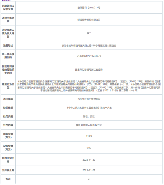 2022年11月,国家外汇管理局浙江省分局下发浙外管罚〔2022〕7号行政处罚决定书,指出财通证券违反多项涉及外汇管理的法律法规。根据《中华人民共和国外汇管理条例》第四十八条,国家外汇管理局浙江分局对财通证券予以警告,罚款14万元。
