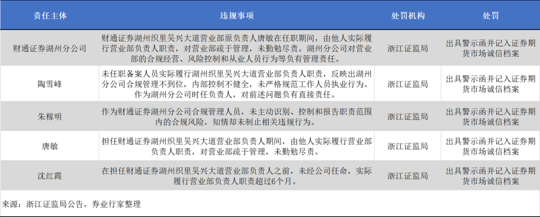 2022年8月26日,浙江证监局对财通证券连下五份罚单:织里营业部两任负责人唐敏、沈红霞,湖州分公司及时任分公司负责人陶雪峰,分公司合规管理人员朱稼明,均被监管警示,并记入诚信档案。