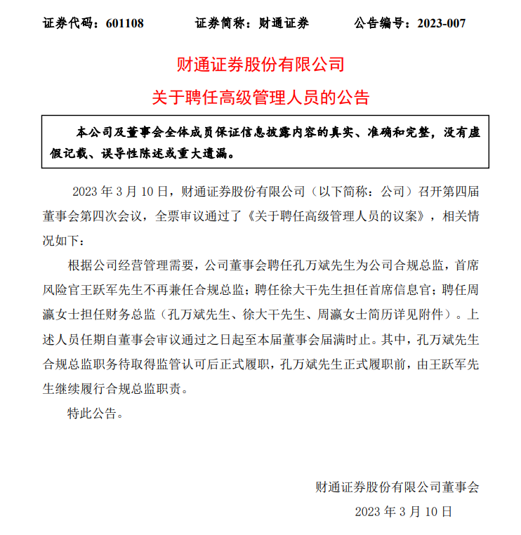 稍早之前的3月10日,财通证券召开第四届董事会第四次会议,涉及多项高管任职变动。财通证券表述,根据公司经营管理需要,董事会聘任孔万斌先生为公司合规总监,在监管认可后正式履职;首席风险官王跃军先生不再兼任合规总监;聘任徐大干先生担任首席信息官;聘任周瀛女士担任财务总监。