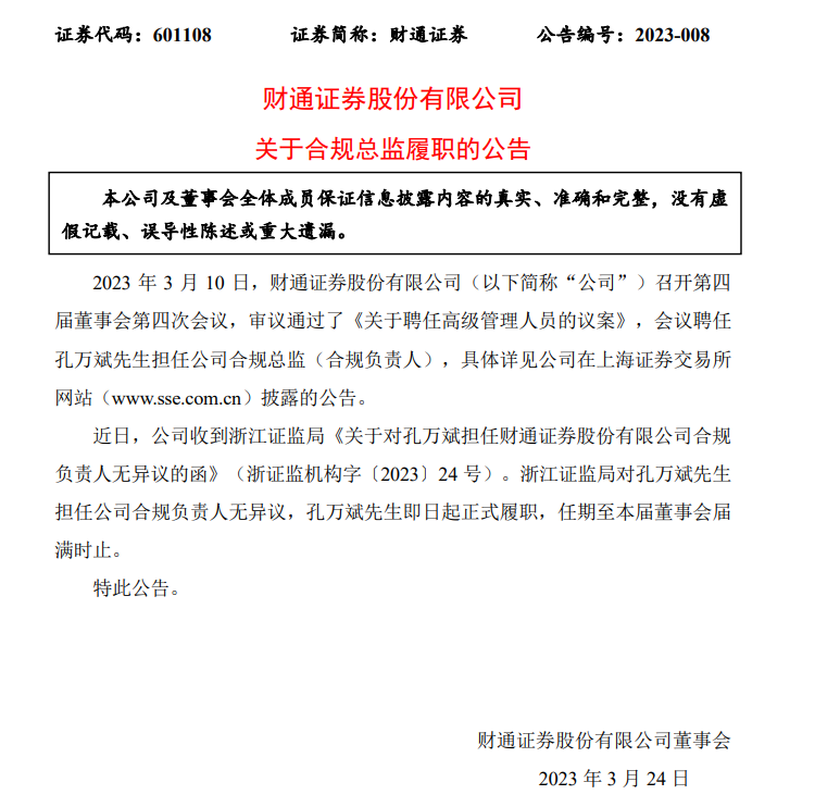 3月24日,财通证券发布公告表示,已收到浙江证监局无异议函(浙证监机构字〔2023〕24号),对孔万斌担任公司合规负责人无异议。孔万斌即日起正式履职,任期至本届董事会届满时止。