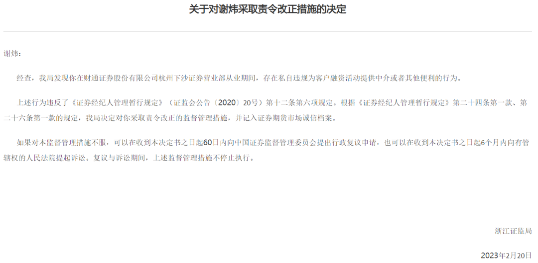 不久前,浙江证监局披露了一起监管处罚函,下发日期为2023年2月20日。当事人谢炜在财通证券杭州下沙证券营业部(简称:下沙营业部)从业期间私自违规为客户融资活动提供中介或者其他便利,浙江证监局对其采取责令改正的监管措施。