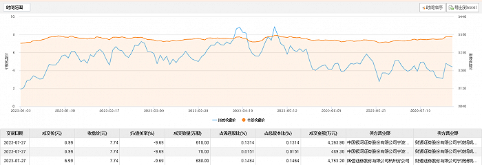 财通证券7月27日大宗交易成交1360万股,成交额9506.4万元,占当日总成交额的25.69%,成交价6.99元,较市场收盘价7.74元折价9.69%。