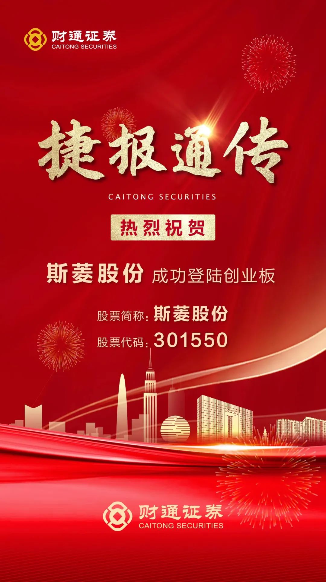 财通证券党委委员、副总经理夏理芬出席上市仪式并致辞。他表示,财通证券致力做浙商浙企自己家的券商,此次助力斯菱股份这样优秀的浙江民营企业登陆创业板,是财通证券服务“专精特新”的又一成果。未来,财通证券将继续以客户为中心,践行“金为实服务”,助力浙商浙企高质量发展,增强地方经济发展活力。