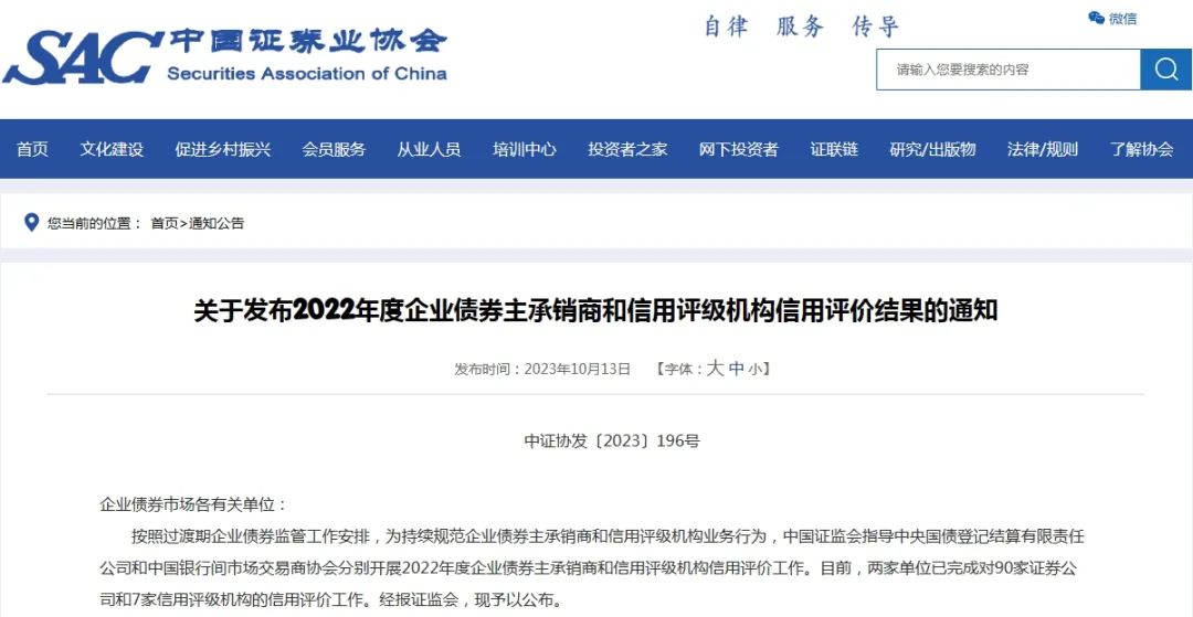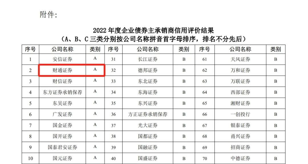 2023年10月13日,中国证券业协会发布2022年度企业债券主承销商信用评级结果,财通证券凭借信用情况、业务行为合规度及债券承销服务质量等方面的出色表现,获评2022年度企业债券主承销商信用评价A类。