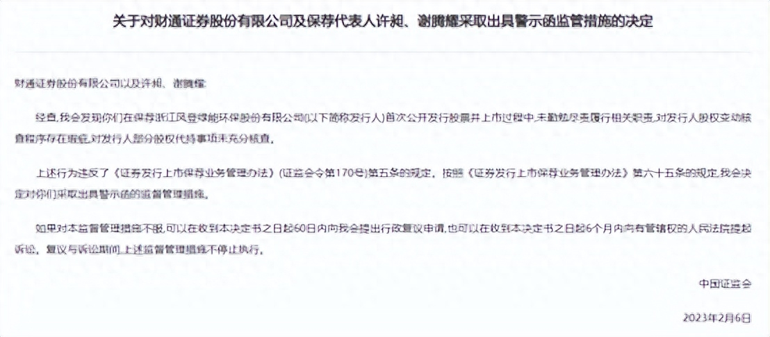 值得注意的是,今年年初,财通证券因在保荐浙江凤登绿能环保股份有限公司首次公开发行股票并上市过程中,存在未勤勉尽责履行相关职责、对发行人股权变动核查程序存在瑕疵、对发行人部分股权代持事项未充分核查等违规行为,公司及保荐代表人许昶、谢腾耀被中国证监会出具警示函。