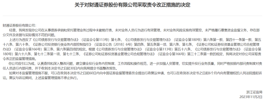 经查,浙江证监局发现财通证券在从事债券承销和受托管理业务过程中存在未勤勉尽责,未对业务人员行为进行有效管理,未对业务风险实施有效管控,未严格履行募集资金监督义务,存在部分文件及依据与实际情况不符的问题。