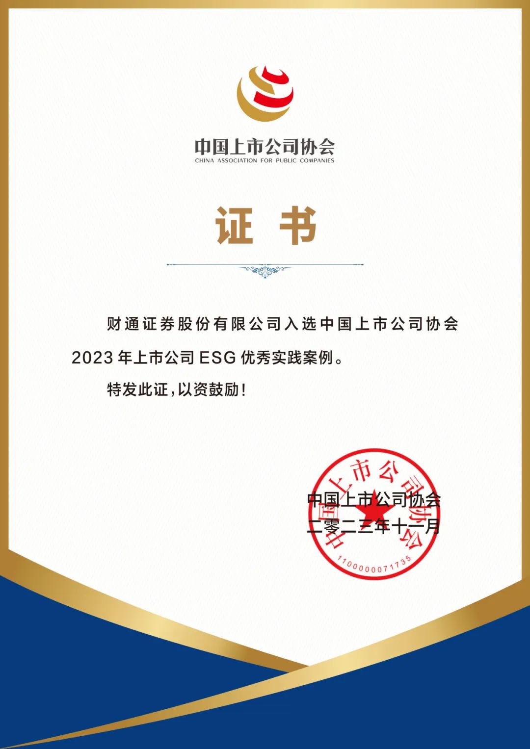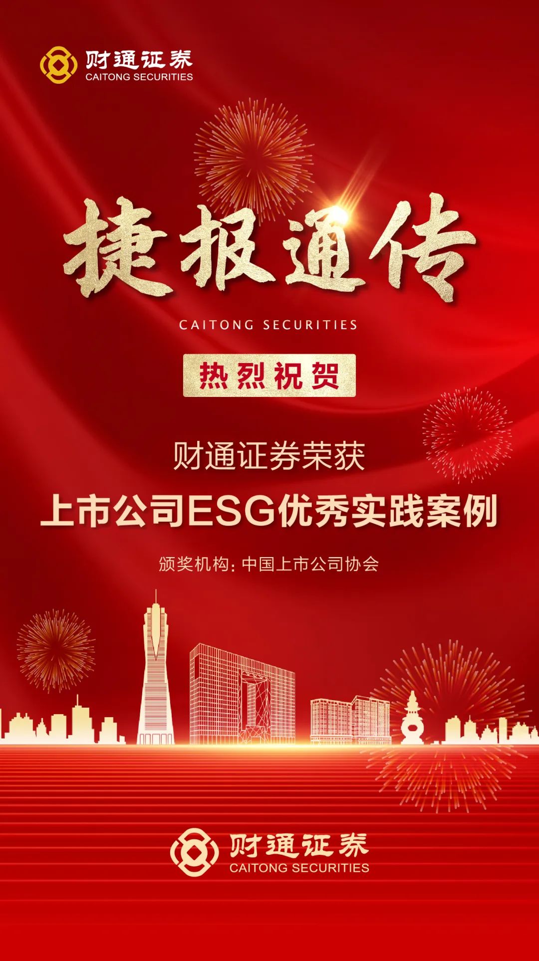 11月16日,中国上市公司协会发布了《2023中国上市公司ESG最佳实践案例》报告,并为众多行业龙头企业颁发了“上市公司ESG最佳实践案例”和“上市公司ESG优秀实践案例”奖项。其中,财通证券ESG案例“党建引领,科技赋能丨打造ESG实践国企金融样板”和“让绿色金融为浙江经济高质量发展赋能”均荣获“2023年上市公司ESG优秀实践案例”,财通证券已连续两年入选该榜单,反映了上市公司协会及社会各界对公司在ESG管理、实践、信息披露等多个领域履职尽责工作的充分认可。