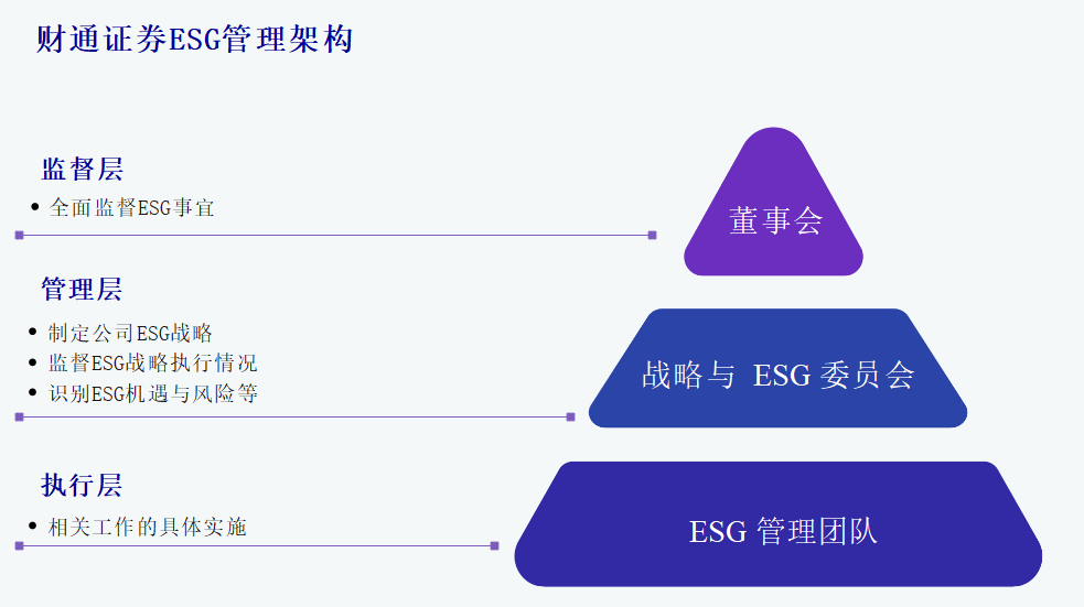 作为国有金融机构,财通证券深入贯彻落实中央金融工作会议精神,持续筑牢“金融服务实体经济”发展站位,在“137N”新战略体系引领下,服务大局、赋能实体、深耕浙江,2022年起,财通证券深入推动ESG因子融入公司发展,发布了《财通证券股份有限公司环境和社会管理声明》《责任投资声明》《对外行使投票表决权声明》等声明,展现公司对ESG管理的承诺与决心。不断推进责任投资、绿色金融和社会公益等多个领域可持续发展,着力为各利益相关方创造包容共济的共享价值。