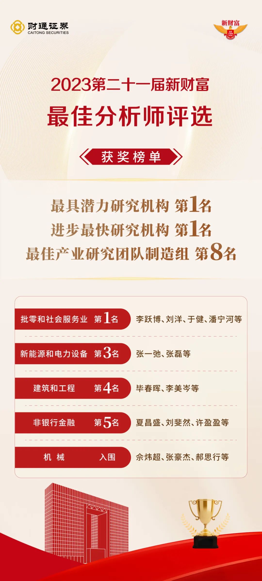 其中,4大团队荣获最佳分析师:李跃博、刘洋团队荣获批零和社会服务业第1名,张一弛团队荣获新能源和电力设备行业第3名,毕春晖团队荣获建筑和工程行业第4名,夏昌盛团队荣获非银行金融行业第5名;佘炜超团队入围机械行业最佳分析师。同时,财通研究获评2023新财富最佳产业研究团队制造业第8名。本次参评结果,是财通证券开展卖方研究业务以来取得的重大突破。