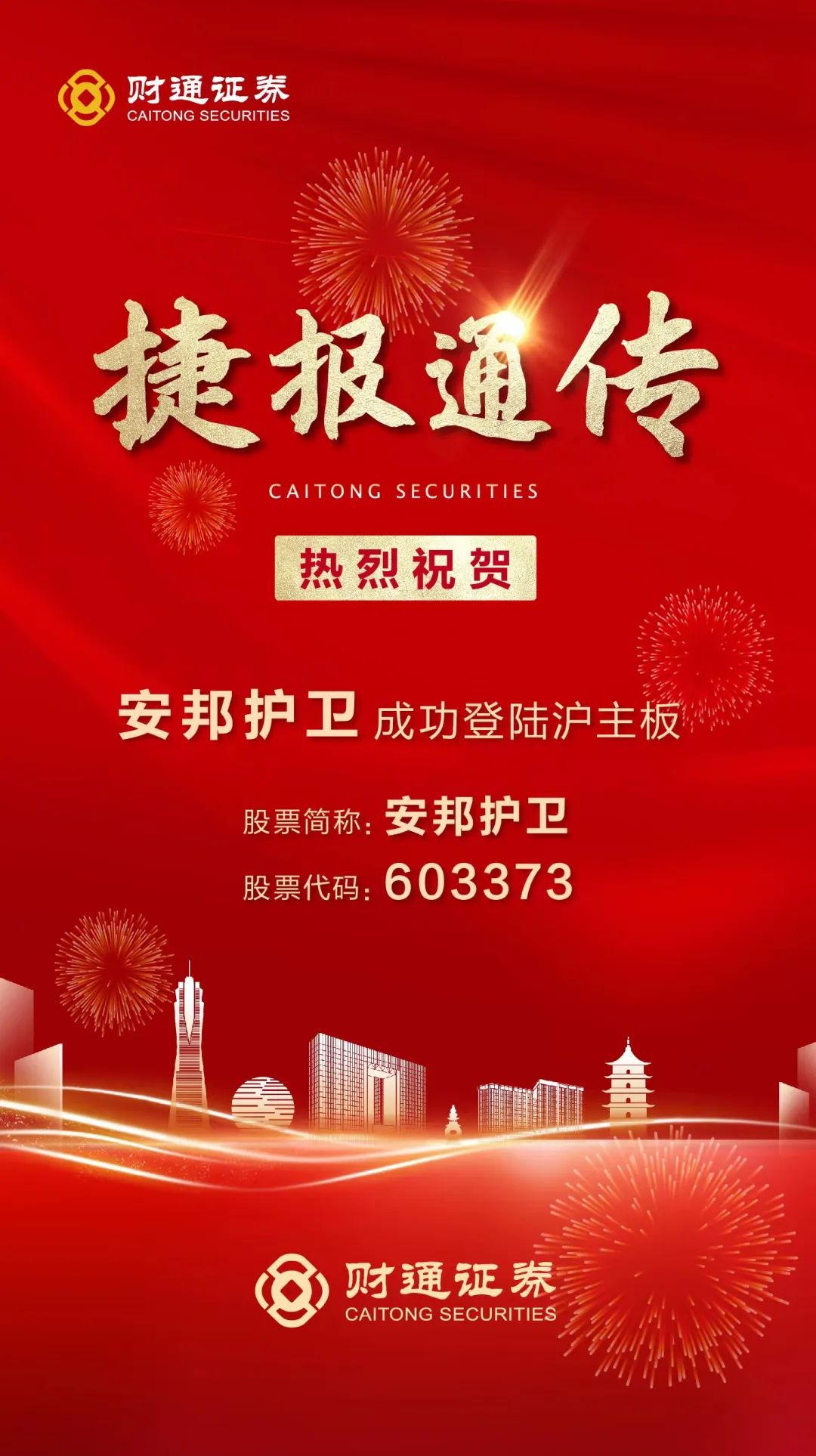 2023年12月20日,安邦护卫集团股份有限公司(以下简称“安邦护卫”,股票代码:603373.SH)成功在上海证券交易所主板上市,财通证券担任保荐机构和主承销商。
