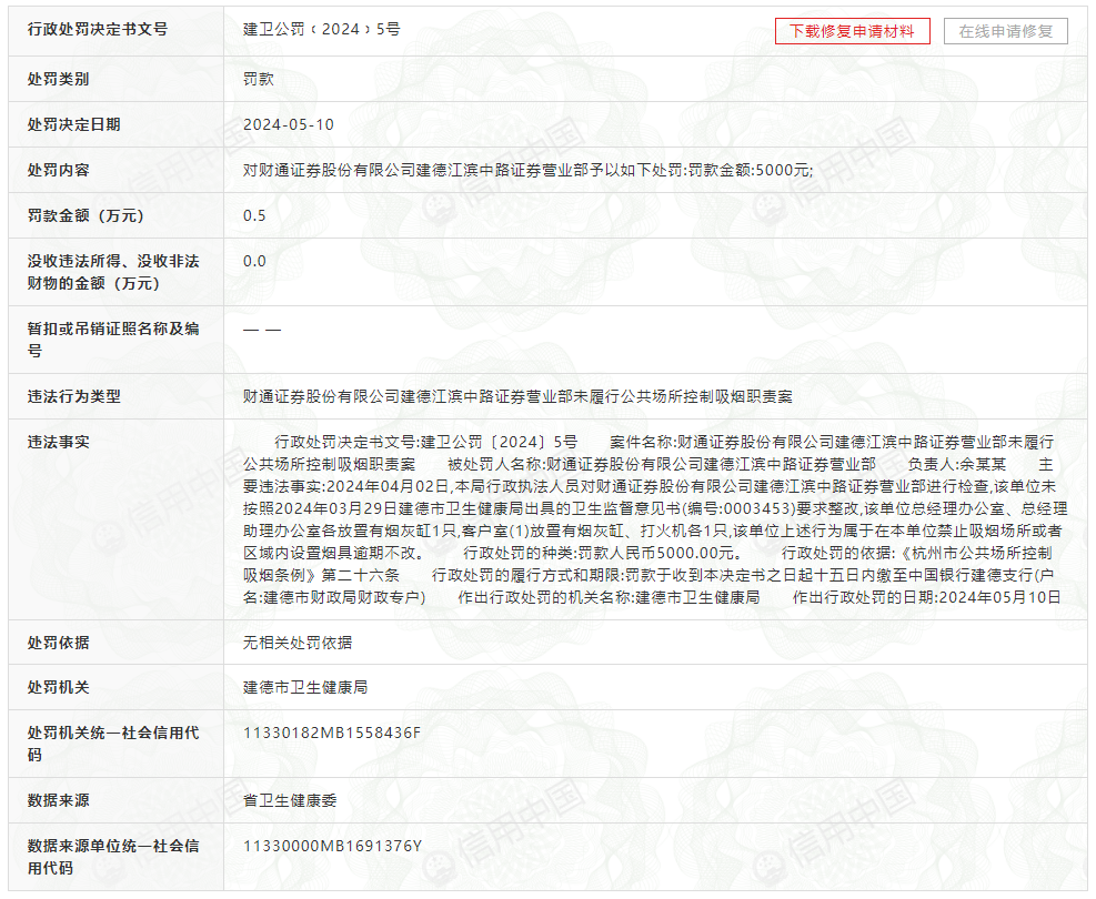 来自建德市卫生健康局的建卫公罚〔2024〕5号行政处罚函显示,财通证券股份有限公司建德江滨中路证券营业部(简称:建德营业部)未履行公共场所控制吸烟职责。