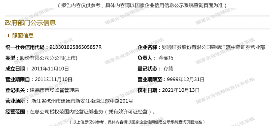 而坐镇建德营业部的这位老总,也是颇有来头。伟海精英显示,余女士在2008年2月首次登记执业于银河证券,曾任职于杭州中河中路营业部(现为杭州景芳营业部)。2013年10月,她加入财通证券。次年3月,浙江证监局批准其分支机构负责人任职,由此担任建德营业部总经理,至今已有十年。