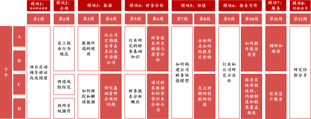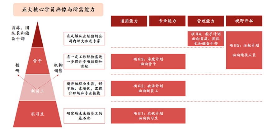 为全面加强“三支队伍”建设,全力打造高水平专业型人才队伍和高素养成长型员工队伍,助推研究所发展目标落地,研究所针对不同职业阶段员工制定培养发展计划。其中,“破浪计划”旨在快速提升新入行研究员、机构销售的通用及专业能力。