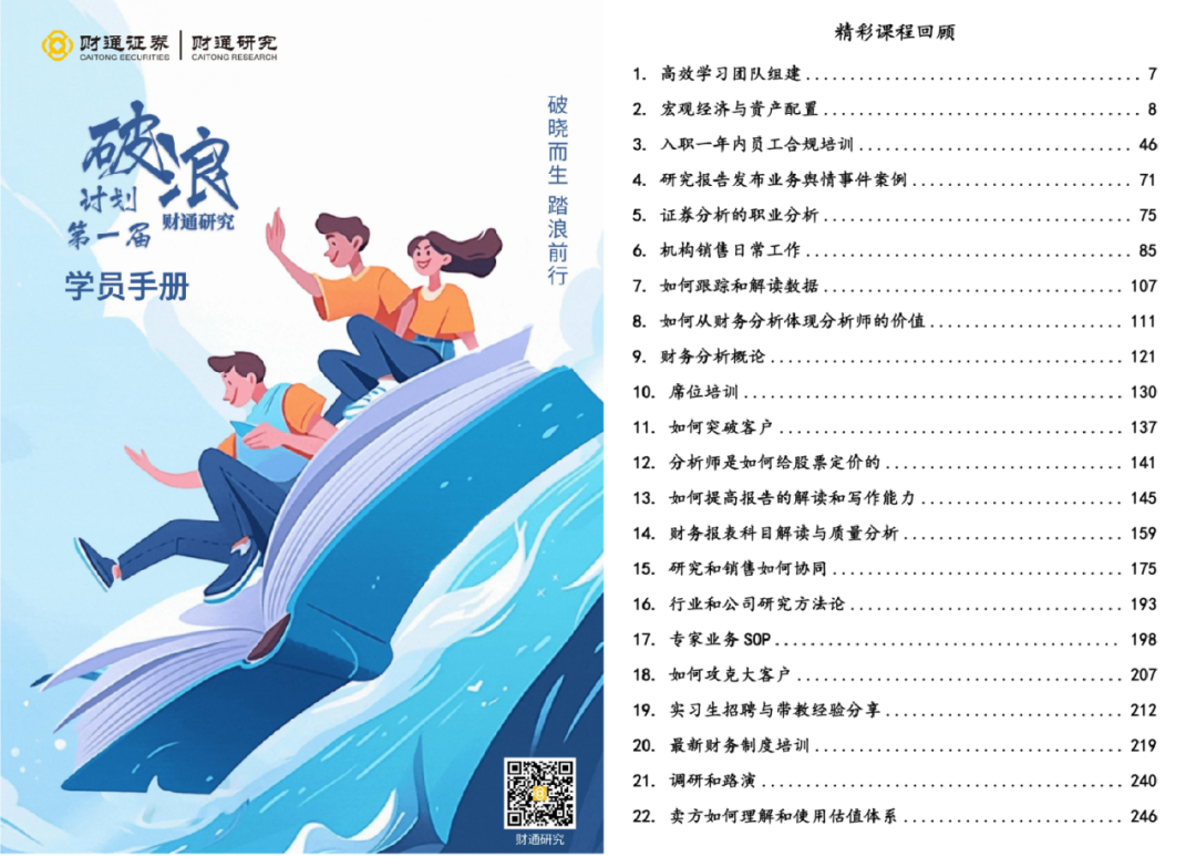 “破浪计划”加速了新同事对研究所业务理解、岗位适应及公司文化融入。培训内容覆盖了高效学习方法、团队建设策略、合规风险控制、证券市场分析以及业务操作规范等多个维度,确保新同事能够在多方面获得必要的知识和技能,以快速胜任其岗位工作。