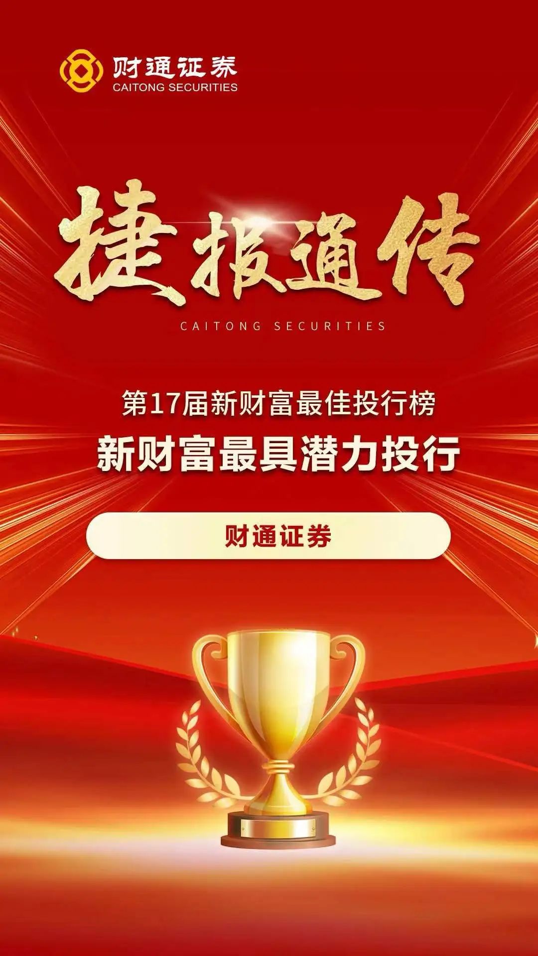 日前,第17届新财富最佳投行评选结果揭晓,财通证券荣获“新财富最具潜力投行”奖项。