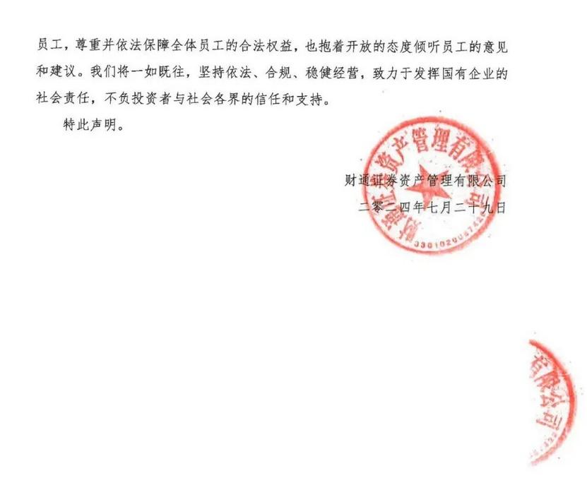 微信公众号“财通证券资管”发布《关于网传不实信息的声明》回应称,员工边某某在微信朋友圈、微信聊天群等公众平台发布针对公司与相关员工的不实信息,严重侵害公司及相关员工的声誉及合法权益。公司及相关员工均已报警,要求边某某停止对本公司及相关员工合法权益的侵害,承担相应的法律责任。