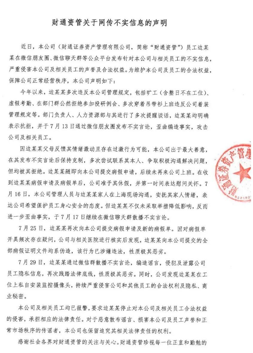声明中称,今年以来,边某某多次违反公司管理规定,包括旷工(含整日不在工位)、虚假考勤、在部门群公然拒绝参加投研例会、多次穿着吊带衫上班违反公司着装管理规定等。部门负责人、人力资源部与其进行了多次提醒谈话,边某某均明确表示抗拒,并于7月13日通过微信朋友圈发布不实言论,歪曲编造事实,攻击公司及相关员工。