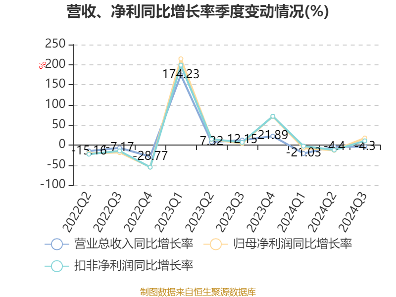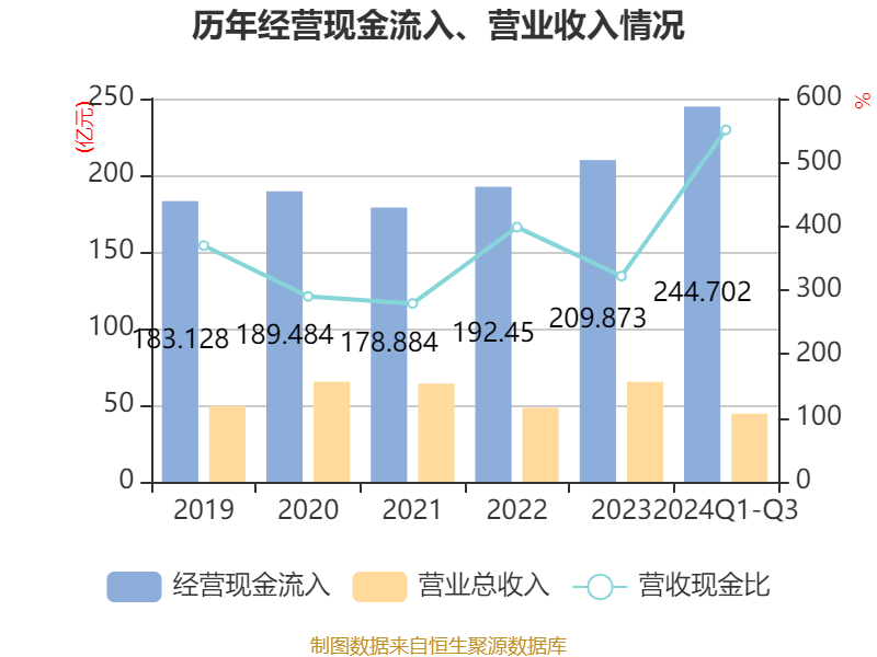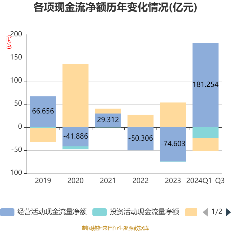2024年前三季度,公司经营活动现金流净额为181.25亿元,同比增加208.2亿元;筹资活动现金流净额-28.45亿元,同比减少17.91亿元;投资活动现金流净额-24.02亿元,上年同期为-2.15亿元。